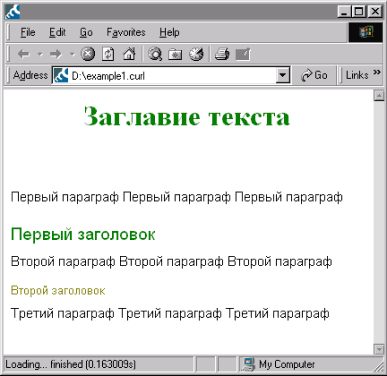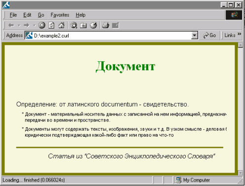 {curl 1.6 applet} - определитель языка Curl, который указывает на то, что файл содержит апплет, написанный на API 1.6, который может исполняться на Surge plug-in версии 1.1. || - оператор комментария, данный оператор ставится в начале строки; текст который стоит после него, но до конца строки является комментарием. {title font-family="Font name", font-size=Npt, color="color", text } - оператор описывающий заглавие текста, где font-family - имя шрифта, font-size - размер шрифта, color - цвет текста, text - текст заглавия; определители font-family, font-size и color являются необязательными и если они неописаны, то будут приняты значения текста по умолчанию. {paragraph font-style="style", text} - оператор описывающий параграф текста, где font-style - стиль шрифта, text - текст заглавия. Может использоваться со следующими операторами text, italic, bold, itemize. {heading level = N, font-family="Font name", font-size=Npt, color="color", text } - оператор для описания заголовков, где level - предустановленный тип заголовка, font-family - имя шрифта, font-size - размер шрифта, color - цвет текста, text - текст заглавия. Ниже представлен результат работы вышеприведенного примера: