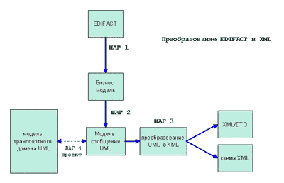 Рис 3. Шаг 1 - ручное преобразование в Бизнес модель (БМ) на основе использования Руководства по разработки сообщений EDIFACT. При этом преобразовании имеется в виду перенос синтаксиса элементов EDIFACT всех спецификаций и выделение функциональной спецификации на содержание информации и ее структуры. Шаг 2 - преобразование БМ в UML Модель сообщений. Преобразование поддерживается программным комплексом моделирования UML, используются такой аппарат как класс диаграмм, класс списка атрибутов и т.д. Шаг 3 - создание соответствия Бизнес модели XML/DTD и XML-схемы. Данное преобразование осуществляется специально разработанным программным обеспечением. Шаг 4 - (необязательный) Возможность запомнить образ UML Модели сообщения и создание домена транспортной модели для использования накопленного опыта при разработке других типов сообщения. Точное отражение EDIFACT структуры включает имена сегментов, составных и отдельных элементов данных. Сообщение UN/EDIFACT можно разобрать на следующие самостоятельные единицы, вложенные друг в друга: