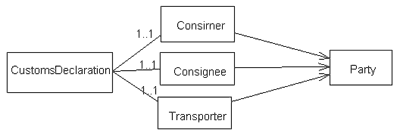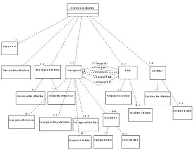 Эти значения всегда используются при создании XML/DTD или схемы XML. Бизнес правила могут быть определены для более сложных зависимостей в БМ. Хотя бизнес правила не используются при создании XML/DTD или XML схемы. Комментарии о терме данных в БМ могут быть скопированы как комментарии атрибутов. Оны будут использованы для документирования. Стандартные ссылки представляют уникальный идентификатор какточеку определения стандартного атрибута т.е. номер тага элемента данных UN/EDIFACT. Они могут быть использованы для документирования, а также и при создании XML/DTD и схемы XML как альтернативных атрибут имени. Ниже на рис. 4 приведена диаграма классов UML бизнес модели сообщения CusDec: