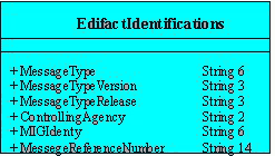 Данная техника моделирования может быть использована в основной модели при моделировании ролей. Однако она не может быть использована при моделировании самого сообщения, т.к. наследование увеличивает комплексный уровень генерации описаний тагов XML. Данные термов в секции могут быть категоризированны как: необязательный терм данных, имя роли и значение кода (см таблицу 2). Возращаясь к примеру в таблице 2 значение терма (терм кодов) A1-3 (Customs procedure ) в справочнике кодов 8323 имеет значение 1- export и 2- import, значение CU для роли A1-7 (Consignor reference number ) по справочнику кодов 1153 , а значение для данных A1-2 (Document issue date ) является датой принятия документа (например 12/12/2000). Правило 5. Создание атрибутов для термов данных и кодов значений. Атрибут создается для каждого необязательного терма данных и располагается в классе сообщения, соответствующего атрибуту секции. Секция, состоящая из кодов значений, должна быть преобразована в один атрибут, который всегда имеет значение соответствующее списку кодов. Ниже приведен пример для секции A3 "Идентификация EDIFACT сообщения"