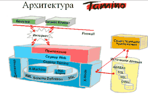 Tamino был создан для решения именно этих проблем. Технология TaminoС выпуском Tamino компания Software AG представляет новое поколение СУБД, первый в мире информационный XML-сервер, являющийся быстродействующим, надежным, высоко масштабируемым продуктом, основанным на открытых стандартах. Компоненты Tamino обеспечивают решение поставленной задачи - обеспечивать быстрый, но плавный процесс изменения ИТ - поскольку Tamino объединяет технологии Интернет с современными достижениями в области разработки баз данных и средств доступа к существующим базам данных. Информационный сервер Tamino представляет собой совершенно новую разработку интегрированного решения, включающего в себя: Технология X-Machine Высокопроизводительный инструмент для хранения XML-данных в их оригинальном виде, включая возможность подключения функциональных расширений сервера, написанных пользователем, для выполнения различных операций преобразования документов. Технология X-Machine позволяет хранить и искать объекты данных, относящихся к бизнес-процессам, в их оригинальном виде. X-Machine представляет собой первую в мире реализацию истинной базы данных XML. Tamino поддерживает XML V.1.0, язык ссылок XLL, таблицы стилей XSL и подмножество XQL, а также концепцию пространства имен XML.