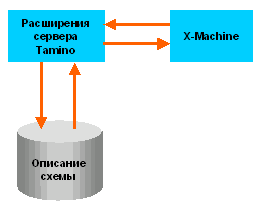 Архитектура Tamino позволяет пользователям встраивать специализированные функции для дополнительной обработки информации, обеспечивающие возможности работы с данными, хранящимися в Tamino, которые, в свою очередь, могут быть представлены как XML, так и не-XML структуры. Программы-расширения сервера устанавливаются на узле сервера с помощью Диспетчера Tamino, и, будучи установленными, доступны пользователям как стандартные встроенные функции сервера. Кроме того, расширения сервера могут использоваться для реализации динамического отображения данных, т.е. преобразования структуры XML в структуру РУСБД на основании значения элемента документа. Расширения сервера являются составной частью Tamino, и могут быть написаны на C, C++ или на других языках, поддерживающих COM/DCOM. Предлагаемый инструментарий среды разработки оснащен помощниками (Wizards), упрощающих процесс написания программ. Применение расширений сервера позволит уменьшить нагрузку на сеть за счет перевода обработки данных с клиента на сервер. Описание схемы