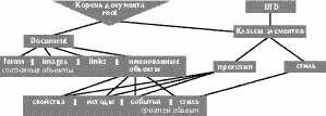 Стоит отметить, что для использования идентификатора у элемента разметки в JScript совсем необязательно создавать связанный с ним селектор идентификатора в описаниях стилей - управлять через него стилями все равно нельзя. Программирование стилей естественным образом приводит к переформатированию документа, что нарушает принципы неизменности загруженного документа JavaScript. В предыдущем примере это используется для изменения кегля гипертекстовой ссылки, к которой мы обращаемся как к элементу коллекции (встроенному массиву) гипертекстовых ссылок. Выбираем же этот элемент последовательно, применяя методы tags() и items(), либо обращаясь к массиву links[]. JScript позволяет поименовать любой элемент разметки документа, однако делается это не через атрибут name, а через атрибут id. При этом у поименованного таким образом объекта есть два свойства innerText и innerHTML. Свойства эти можно изменять. Первое из них позволяет изменить текст внутри элемента разметки, а второе - содержание HTML-разметки внутри элемента разметки, что дает возможность создавать новые объекты внутри документа. <p id=kuku onMouseover= <document.all.ref.style .color='red';document.all.ref .innerText='красная гипертекстовая ссылка';> onMouseout= <document.all.ref .style.color='blue'; document.all.ref.innerText= 'гипертекстовая ссылка';>> Здесь размещена <a href=... id=ref onClick= <document.all.kuku.innerHTML= 'Здесь нет гипертекстовой ссылки'; return false;> style= <color:blue;>> гипертекстовая ссылка </a> </p> В последнем примере обработчики событий onMouseover и onMouseout применялись для обработки движения мыши над блоком текста, т.е. событий, связанных с пассивным элементом разметки. Здесь мы наблюдаем принципиальное отличие от первоначальной модели событий JavaScript. Любое событие может быть связано с элементом разметки - это достигается указанием у этого элемента атрибута обработчика данного события. Другими словами, у всех элементов разметки определен весь перечень возможных событий и обработчики этих событий для каждого класса элементов. Программист через атрибут обработчика может переопределить действие, выполняемое по умолчанию. В JScript применяется "пузырьковый" метод обработки событий. Это означает, что если для какого-то объекта происходит некоторое событие, то сначала вызывается обработчик события, связанный с этим объектом, а потом событие передается обработчику данного события для старшего объекта в иерархии объектов документа. Программист имеет возможность запретить передачу обработки события наверх. Для поддержки совместимости со статическим HTML и JavaScript большинство обработчиков не выполняют никаких операций, хотя по умолчанию события всегда транслируются на верхний уровень. И последний штрих к "портрету" JScript. Этот язык и его модель данных можно использовать для программирования Active Server Pages (ASP). Главное здесь не запутаться между директивами JScript, предназначенными для интерпретации на стороне сервера и JScript-кодом, который следует исполнять на стороне браузера. Интерфейс прикладного программирования DOMОбъектные модели данных JavaScript, JScript и Java предшествовали появленю Document Object Model [7] - спецификации интерфейса прикладного программирования для HTML и XML. DOM наследует многие свойства этих моделей и творчески развивает их. DOM определяет логическую структуру документа, способы доступа к его элементам и манипулирования ими. При этом термин "документ" понимается широко - это единица информационного опи