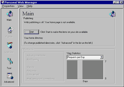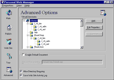 Рис. 2 Правила хорошего тона предписывают хранить создаваемые файлы проекта каждый в своем каталоге, поэтому в директории C:\Inetpub\wwwroot создадим папку Proba, куда потом поместим наш *.asp файл. Но прежде чем перейти непосредственно к использованию ASP, необходимо чуть изменить настройки Web-сервера. Как я сказал, файлы Web-сервера хранятся в каталоге C:\Inetpub\wwwroot этот путь указывает на физический каталог, т.е. на реальную область весткого диска. Пользователь Интернет обращается к файлам в этом каталоге с помощью URL, например http://user-0000011660/Proba/default.asp, а как же соотнести адрес URL с конкретным физическим каталогом? Для этого используют виртуальные каталоги. Виртуальные каталоги выступают в роли псевданимов для реальных каталогов и являются одним из важных компонентов управляемых PWS. После того, как мы создали папку Proba нажмите на кнопку 'Start' и PWS запустится. Теперь щелкните на иконке Advanced, PWS изменит свой вид и перед вами появится окно Advanced Options (рис. 3).