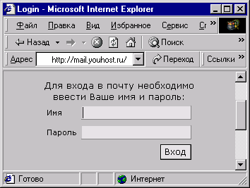 - проблемы с плохими каналами при удаленном доступе; У нас такая проблема возникла в связи с использованием операционной системы Windows NT и прокси-сервера для доступа к интернету. Подобная картина наблюдается, по-моему, во многих классах общего доступа. Обычно класс входит в домен Windows NT и все пользователи имеют свою учетную запись. Поэтому было решено построить вебпочту на базе Windows 4.0 Option Pack для Windows NT Server (OP). В комплекте OP имеется SMTP-сервер, и пользователи Windows NT автоматически получают на нем учетную запись. Еще один компонент, который нам необходим - Microsoft CDO for NTS Library (Collaboration Data Objects for Windows NT Server). Этот компонент при работе с SMTP-сервером обращается к общей папке с сообщениями (обычно Mailroot/Drop) и работает с ними в зависимости от имени пользователя. Перейдем непосредственно к тому, как работает вебпочта. 1. Авторизация.Для авторизации пользователя можно использовать несколько методов. Самый простой - у первой странички убрать анонимный доступ. В этом случае пользователь при обращении к странице должен будет ввести ИМЯ и ПАРОЛЬ в стандартном окне для авторизации. Я использовал этот метод, но немного изменил его. Пользователь вводит ИМЯ и ПАРОЛЬ в стандартной форме.