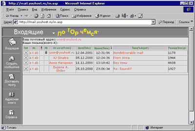 Можно сохранять индивидуальные настройки для каждого пользователя, используя текстовый документ или Cookies. Большой недостаток VB-Script - мало функций для работы с текстовыми строками. 6. Выводы.Как видно из вышесказанного, построение вебпочты на ASP под Windows NT вполне возможно и довольно просто. Есть и недостатки: SMTP-сервер при плохих каналах может терять сообщения и др.; при большом количестве почтовых сообщений компонент CDO замедляет свою работу. Ну и, конечно, необходимо позаботиться о безопасности. Вернер А. Р., оригинальный текст http://verner.asf.ru