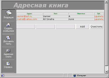 5. Адресная книга и др.Адресную книгу можно создать, сохраняя в текстовом файле данные об адресатах. Например вот так: