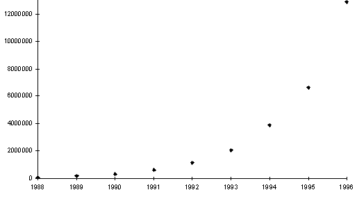 В настоящее время около 60% пользователей Internet живет в США, 21% в Европе и 6% - в Японии. Численность подсоединенных к Internet хостов [3] растет по экспоненциальному закону, что иллюстрируется рис. 2.4.