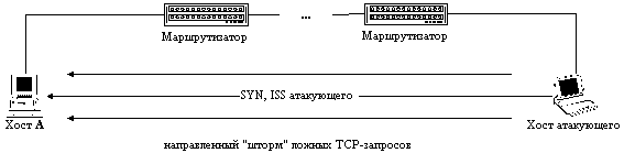 4.6. Нарушение работоспособности хоста в сети Internet при использовании направленного "шторма" ложных TCP-запросов на создание соединения, либо при переполнении очереди запросовИз рассмотренной в предыдущем пункте схемы создания TCP-соединения следует, что на каждый полученный TCP-запрос на создание соединения операционная система должна сгенерировать начальное значение идентификатора ISN и отослать его в ответ на запросивший хост. При этом, так как в сети Internet (стандарта IPv4) не предусмотрен контроль за IP-адресом отправителя сообщения, то невозможно отследить истинный маршрут, пройденный IP-пакетом, и, следовательно, у конечных абонентов сети нет возможности ограничить число возможных запросов, принимаемых в единицу времени от одного хоста. Поэтому возможно осуществление типовой УА "Отказ в обслуживании" (п. 3.2.4), которая будет заключаться в передаче на атакуемый хост как можно большего числа ложных TCP-запросов на создание соединения от имени любого хоста в сети (рис. 4.11). При этом атакуемая сетевая ОС в зависимости от вычислительной мощности компьютера либо - в худшем случае - практически зависает, либо - в лучшем случае - перестает реагировать на легальные запросы на подключение (отказ в обслуживании). Это происходит из-за того, что для всей массы полученных ложных запросов система должна, во-первых, сохранить в памяти полученную в каждом запросе информацию и, во-вторых, выработать и отослать ответ на каждый запрос. Таким образом, все ресурсы системы "съедаются" ложными запросами: переполняется очередь запросов и система занимается только их обработкой. Эффективность данной удаленной атаки тем выше, чем больше пропускная способность канала между атакующим и целью атаки, и тем меньше, чем больше вычислительная мощь атакуемого компьютера (число и быстродействие процессоров, объем ОЗУ и т. д.).