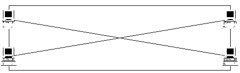 6.1. Выделенный канал связи между объектами распределенной ВСВсе объекты распределенной ВС взаимодействуют между собой по каналам связи. В п. 5.1.1 рассматривалась причина успеха УА, состоящая в использовании в РВС для связи между объектами широковещательной среды передачи которое означает, что все объекты распределенной ВС подключаются к одной общей шине (топология сети - "общая шина" , рис. 6.1). Это приводит к тому, что сообщение, предназначенное (адресованное) только одному объекту системы, будет получено всеми ее объектами. Однако только объект, адрес которого указан в заголовке сообщения как адрес назначения, будет считаться тем объектом, кому это сообщение непосредственно направлялось. Очевидно, что в РВС с топологией "общая шина" необходимо использовать специальные методы идентификации объектов (п. 6.2), так как идентификация на канальном уровне возможна только в случае использования сетевых криптокарт. Также очевидно, что идеальной с точки зрения безопасности будет взаимодействие объектов распределенной ВС по выделенным каналам. Существуют два возможных способа организации топологии распределенной ВС с выделенными каналами. В первом случае каждый объект связывается физическими линиями связи со всеми объектами системы (рис. 6.2). Во втором случае в системе может использоваться сетевой концентратор, через который осуществляется связь между объектами (топология "звезда" - рис. 6.3). Следует заметить, что в этом случае нарушается один из принципов, на которых строилась сеть Internet: сеть должна функционировать при выходе из строя любой ее части.