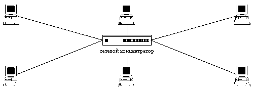 Рис. 6.3. Сетевая топология "звезда". Плюсы распределенной ВС с выделенными каналами связи между объектами состоят в следующем: