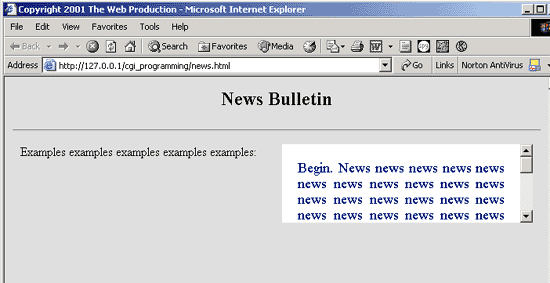 В процессе загрузки в броузер новостной HTML-страницы, управление передается CGI-скрипту, который считывает обычный текстовый файл bulletin.txt с диска сервера, создает на лету HTML-вставку и выводит ресурс в элемент IFRAME. Для наглядности, HTML-вставка размещена в теле CGI-скрипта. В реальной ситуации, HTML-вставка существует в виде шаблона в каталоге шаблонов на сервере или находиться в таблице шаблонов в БД. Ниже представлена собственно новостная HTML-страница (news.html):