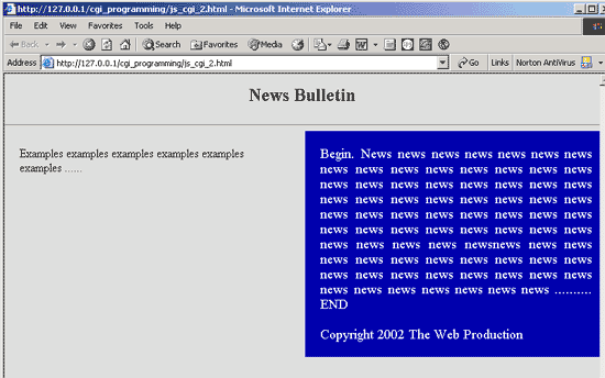 Отметим, что изменение кода HTML-вставки, выразилось лишь только в замене массива @lines на переменную $news. Автоматическая выборка новостной информации из БД хороший пример сокращения затрат на содержание сайтов средних и крупных размеров, порталов, интернет-магазинов и.т.п. Редактор новостей корпоративной сети, по мере поступления новостной информации, заносит ее в БД. Дальнейшее распространение и публикация новостей происходит без его участия и без помощи дизайнеров и программистов. §3. CGI-JavaScript программирование.В рассмотренных выше примерах вставка возвращаемых данных осуществлялась, со стороны броузера, пассивно. Активное взаимодействие сценариев CGI и скриптов языка JavaScript в значительной степени расширяет возможности представления и обработки этих данных. В качестве примера, рассмотрим задачу охраны авторского права на публикуемую новостную информацию. Задача. Решение. Загрузка CGI ресурса выполняется с помощью атрибута SRC элемента SCRIPT: <SCRIPT language="JavaScript" src="../cgi-bin/jscgi_prog.cgi"></SCRIPT>. Расссмотрим сначала код HTML-страницы: