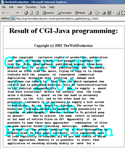 Переменные $database, $host, $port, $login и $pass, для доступа и открытия БД, загружаются в сценарий с помощью команды require из модуля globalvar.pm. Длинна строк $my_leng не превышает 64 символов. Образом для выделения подстрок является пробельный символ " ". Циклическое формирование строк и создание стандартного потока вывода, осуществляется всего шестью строками кода. На Java такое трудно реализовать. Зато на Java легко реализуется графическая форма представления текста. Графический вывод текстовой информации, преследует цель противодействовать несанкционированному копированию новостных данных. Чтобы усилить защиту против копирования, текст выводиться на фоне "водяных знаков" - рис. ... . Теперь потенциальному взломщику потребуется выполнить копирование экрана, обработку полученного изображения в PhotoShop, преобразование графики в текст с помощью FineReader, редактирование текста (FineReader выполняет распознавание текста не на все 100% ). В заключение этого раздела приветем код HTML-страницы: