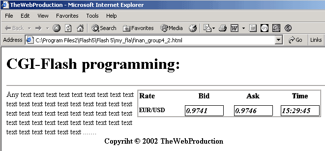 §5. CGI-Flash программирование.Появление технологии Flash компании Macromedia в значительной степени преобразило мир Web. Flash, без особой шумихи (что было свойственно распространению в Web языка Java), быстро занял свою нишу и эволюционировал от внешних plug-in к встроенным в броузеры IE и NN и является в настоящее время полноценной частью инструментов Web-дизайна и Web-программирования. Применение Macromedia Flash избавляет от проблемы совместимости между броузерами, Flash одинаково работает как в IE, так и в NN. В Macromedia Flash 5 применяется специальный событийно-управляемый язык, который поддерживает условные переходы, циклы, массивы, функции и классы, которые можно наследовать. Процедуры ввода-вывода данных, как мы увидим ниже, могут быть реализованы с помошью всего лишь одного оператора этого языка. Задача. Решение. Как мы видим (рис.6), файл Flash finan.swf выводит в HTML-страницу информационную вставку и идеология разделения CGI-программы и дизайна не нарушена.