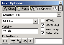 Рис. 6. Аналогичную процедуру выполним для создания имен двух других текстовых переменных: my_ask и my-time. Для верхнего слоя (рис.5) откроем окно Frame Actions и займемся программированием: loadVariablesNum ("http://www.mycgi.com/cgi-bin/java_applet/finan.cgi", 0); Процедура loadVariablesNum загрузит CGI-ресурс, а полученные данные от CGI-скрипта разместит в текстовых переменных: my_bid, my_ask и my-time, соответственно. Заключение.Нет сомнения, что методы программирования, представленные выше, весьма перспективны и фактически применяются Web-программистами. Здесь сделана попытка систематизации. Привлекательность технологии CGI/JavaScript/Java/Flash, на мой взгляд, обусловлена прежде всего ее взаимодополняемостью. Небезизвестно, что технические прорывы, как правило, возникает именно на стыке моно-технологий. Там где приоритет Perl не оспорим, пишем скрипты на Perl, в тех случаях где лучше подходит Java, целесообразно использовать апплеты и т.д. И все это в рамкам одной задачи. Литература: