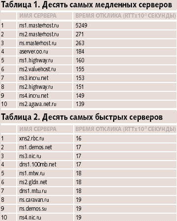Разница между самыми быстрыми и самыми медленными наиболее популярными серверами составляет в среднем порядок. Пять с слишком секунд для ns1.masterhost.ru (два порядка величины) выглядят на этом фоне, мягко говоря, странно. Следует учитывать тот факт, что серверы, поддерживающие домены второго уровня в зоне RU, как и во всем мире [18], в большинстве случаев (70%) одновременно являются и серверами, которые выполняют рекурсивные запросы. Чем ближе данный сервер расположен к корневому серверу, тем больше времени из интервала «приемлемого времени» останется на передачу полезной информации, а не на накладные расходы, к которым относится и служба DNS. Конечно, можно возразить, что важно не как близко ты находишься к корню, а как близко к своим клиентам. Действительно, время отклика кэшируется, и не за каждым адресом приходится обращаться к авторитативному серверу доменных имен. Но больше половины пользователей, собственно, и располагаются около авторитативных серверов зоны RU, что показывает распределение времени отклика серверов доменов второго уровня. Есть еще один момент. Например, rambler.ru, как уже было указано, кэшируется только час, а время доступа до него от ns.ripn.net — 0,004 с. Для mail.ru время доступа от ns.ripn.ru также равняется 0,004 с. Время определяется не только физическим расстоянием, но и качеством, и пропускной способностью канала. Например, для сервера ns.nsk.ru время отклика составляет 0,18 с, а для ns.spb.su — 0,019 с. В таких условиях времена отклика серверов доменных имен провайдеров услуг хостинга, которые превышают 0,15 с, выглядят плохо. Понятно, что это, скорее всего дублирующие серверы (secondary), но алгоритмы выбора серверов resolver предполагают «одинаковость» авторитативных серверов доменов.