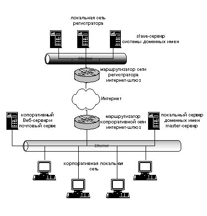 Рис.1. Схема подключения master и slave серверов зоны Из рисунка 1 видно, что корпоративная локальная сеть и сеть регистратора имеют независимые подключения к Интернет, через разных канальных провайдеров. В частности резервирование серверов в ru-center (www.nic.ru) обеспечивает такую схему подключения, т.е. master-сервер может быть размещен на площадке корпоративной локальной сети, а slave на площадке ru-center. Размещение обоих серверов на площадке регистратора, например, ru-center, также обеспечивает независимое подключение серверов, т.к. обычно регистратор имеет несколько точек подключения к Интернет. Как уже было сказано, slave-сервер копирует описание зоны c master-сервера. В настоящее время существует два механизма копирования зоны: полное копирование (AXFR) и инкрементальное (incremental) копирование зоны (IXFR). В современных RFC, которые расширяют толкование механизмов взаимодействия между участниками обмена данными в рамках DNS, типизацию серверов и их разделение на master-серверы и slave-серверы дают относительно процедур копирования зоны. Так slave-сервером называют сервер, который использует механизм передачи зоны для получения копии зоны, а master-сервером называют сервер, с которого осуществляется копирование зоны. При этом зону можно скопировать с любого сервера, который является авторитативным. Т.е. зону можно скопировать и со slave-сервера, который относительно самой процедуры копирования зоны будет считаться master-сервером. Для того чтобы выделить сервер, который не копирует зоны ни с какого другого сервера, вводят понятие Primary Master. Этот сервер для зоны только один, и он находится в корне процедуры копирования описания зоны. Типизация серверов относительно процедуры обмена описаниями зон связана с возможностями, которые не описаны в RFC-1034 и RFC-1035, и, соответственно, не поддерживались в ранних версиях программ-серверов доменных имен. Это механизм объявлений об изменениях в описании зоны (RFC-1996), динамическое обновление описания зоны (RFC-2136) и инкрементальное обновление описания зоны (RFC-1995). Для большинства администраторов корпоративных доменов все эти новшества, возможно, любопытны, но в реальной жизни не слишком полезны, т.к. вся их мощь проявляется только при работе с динамичными описаниями зон, информация в которых подвержена постоянным изменениям. Тем не менее, не сказать о них нельзя, т.к. при работе современными версиями программ-серверов обязательно возникнут вопросы типа "а чтобы это значило". Сначала о том, что такое уведомления об изменениях описания зоны (DNS NOTIFY). Идея достаточно проста и проистекает из проблемы распространения изменений, внесенных в описание зоны при ее редактировании. Дело в том, что slave-серверы при традиционной работе опрашивают master-сервер (в данном контексте primary master) на предмет изменения в описании зоны через определенные промежутки времени, которые задаются в описании зоны. Возможна ситуация, когда изменения были внесены в зону сразу после ее копирования slave-сервером. В этом случае новая информация появится на всех slave-серверах только при следующем обновлении зоны. Ситуация усугубляется еще и тем, что остальные не авторитативные серверы держат записи соответствия между именем домена и IP_адресом в своем кэше в течение времени TTL (Time To Live), которое также определяется в описании зоны. Обычно задержка между внесением изменений и стабильной р