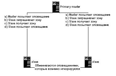 Рис.2. Схема работы DNS NOTIFY На рисунке 2 primary master является для обоих slave-серверов master-сервером c точки зрения процедуры передачи зоны. Но в принципе, для одного из серверов он может быть и не определен в качестве master-сервера. В этом случае появляется дополнительное звено в дереве зависимости обмена данными зоны. В этом случае изменения будут передаваться от сервера к серверу так, как это показано на рисунке 3: