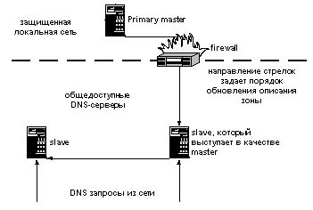 Рис.4. Схема организации DNS-серверов с невидимым primary master сервером Другая причина создания "невидимых" серверов - разгрузка официально зарегистрированных серверов. В этом случае для обслуживания определенного класса клиентов, которые можно настроить на работу с "невидимым" сервером, создается один или несколько slave-серверов зоны. Они являются авторитативными, но неизвестными широкой интернет-общественности. Рассмотрим еще один тип серверов, которые выделяют при описании системы доменных имен - кэширующие (cache) серверы. Этот тип серверов отличается от тех, что мы обсудили раньше, тем, что сервер данного типа не является авторитативным для какой-либо зоны. Серверы данного вида используют для организации централизованного кеширования соответствий доменных имен и IP-адресов. Идея организации кэширующего сервера состоит в том, чтобы на искать соответствие доменного имени и IP-адреса в сети, а накапливать их в своем локальном кэше и обслуживать от туда запросы relover-ов. Кэш-сервер не поддерживает описаний зон и, соответственно, не посылает resolver-ам авторитативных откликов: > www.w3.org Server: [144.206.192.60] Address: 144.206.192.60 Non-authoritative answer: Name: www.w3.org Addresses: 18.29.1.35, 18.7.14.127, 18.29.1.34 > Выше приведен типичный отклик кэширующего сервера на запрос nslookup об адресе www.w3.org. Если бы сервер был авторитативным, то строчки "Non-authoritative answer" в отклике мы бы не увидели. Мы не обсудили еще один тип серверов - это сервера, которые обслуживают корневую зону (Root servers). Их место в получении отклика на запрос к системе доменных имен ключевое. Именно к одному из корневых серверов обращается локальный сервер доменных имен, если не находит в зоне своей ответственности или в своем кэше соответствия между доменным именем и IP-адресом. Список этих серверов можно получить достаточно просто. Ниже приведен отчет программы nslookup: