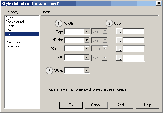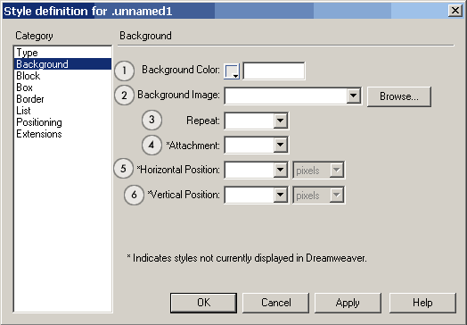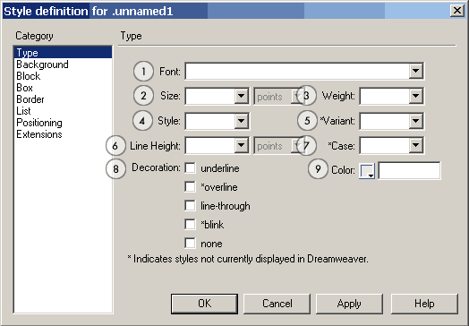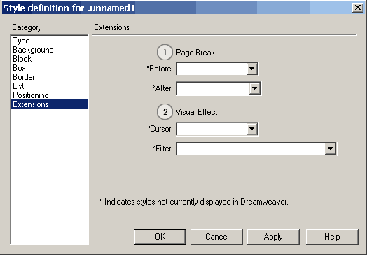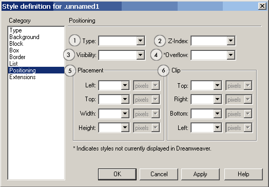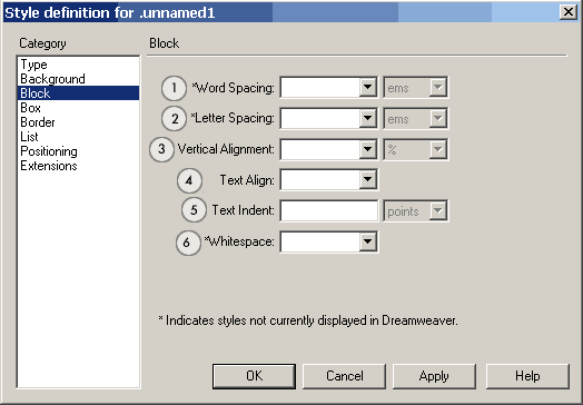Обратите внимание на пункты помеченные *. На этой и на других панелях эта звездочка означает, что данный вариант не отображается визуально в DreamWeaver (т.е. в браузере надо проверять)