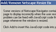 Данная команда "подправляет" неприятную особенность браузеров от Netscape иногда не обновлять содержимое странички при изменения размеров окна браузера. Работает все просто - нажали ADD - нужный скрипт добавился - нашали Remove - скрипт убрался.