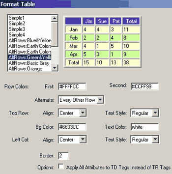 Ну эта штучка вообще сильная... Одной командой можно задать оформление всей таблице. Причем как выбрать из стандартных видов оформления, так и указать свои собственные цвета и параметры. Очень удобно при сложном оформлении таблиц большого размера.