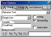 Первая возвращает размер ролика в байтах, а вторая - размер в байтах загруженной части ролика. Напишем простейший прелоадер, для этого создадим новый файл. На Scene1 разместим надписи: Bytes Total, Bytes Loaded, Percent и три "пустые" надписи. Получается примерно следующее: ![]() Теперь в окне Text Options определяем надписи как динамические и назначаем имена переменных для этих надписей (сверху вниз), например: TotalField, LoadField и PercentField: ![]() Для первого кадра в окне Actions (установите режим Expert Mode) пишем код (все кадры - ключевые):
