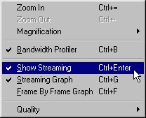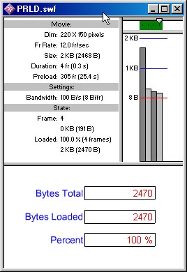 В этом же кадре, но на другом слое уже начинается сам ролик. Разумно нарисовать кнопку Play и передавать управление на начало ролика. Если вы сделали все правильно, то получится примерно следующее (это только картинка): ![]() Если не вышло - вот исходный файл. В этом уроке описаны только конструкции, позволяющие реализовать любой прелоадер, например с линейкой загрузки и т. п., но необходимо учитывать, что все графические "навороты" загружаются в первом кадре, т. е. чем он больше, тем дольше будет грузиться сам прелоадер! А нужен ли вообще прелоадер? Ответить на этот вопрос поможет сам Flash! В режиме Test Movie в меню Debug выберите или установите свою скорость загрузки файла (учтите, что реальная скорость загрузки у пользователя будет гораздо ниже указанной): ![]() В меню View выбираем пункт Show Streaming: ![]() Тестируем наш ролик на различных скоростях загрузки: ![]() Успехов! PS. Обратите внимание: реальный размер ролика 2470 байт, а Flash "говорит", что 2468 байт! Я не знаю почему. Кто знает? Boroda |