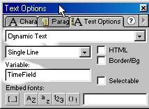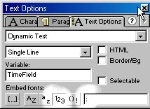 Рассмотрим некоторые возможности объекта, позволяющие создать часы, отображающие системное время. Такие часы можно, например, разместить на странице сайта или встроить в поздравительную открытку. Итак, создадим новый файл размером 100 х 50 px. На Scene1 в первом кадре поместим динамическую текстовую надпись и присвоим ей имя, например TimeField: ![]() Для удобства размещения/выравнивания присвойте значение 00:00:00, все равно в процессе работы ролика надпись изменится. Если вы используете "экзотический" шрифт, укажите Flash, что начертание цифр и разделителя надо храниить в самом ролике: ![]() На этом процесс "рисования" заканчивается. Приступим к кодированию. Для первого кадра в панели ActionScript (не забудьте установить режим ExpertMode) пишем следующий код: