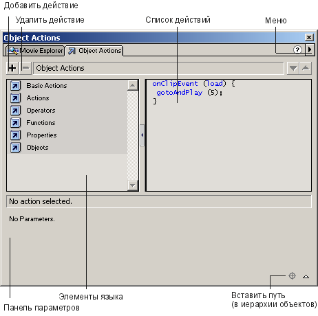 Панель действий (Actions panel), на которой происходит практически все общение с ActionScript.