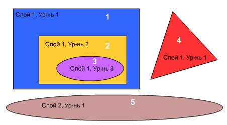 Для иллюстрации возьмем иерархию из 5-ти объектов (рис. 3). Объекты 1-4 находятся на 1-м слое, объект 5 - на 2-м слое. Объект 2 вложен в объект 1, а объект 3 вложен в объект 2. Объекты на рисунке визуально вложены друг в друга, но это ни в коем случае не означает, что так должно быть и "в жизни". Здесь они так сгруппированы для наглядности. Так как имя объекта не может начинаться с цифры, пусть объекты у нас называются obj1-obj5.