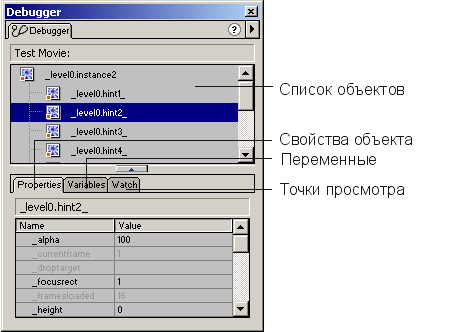 В одной части окна Debugger находится иерархический список объектов, используемых в фильме. Выбрав объект, можно просматривать его свойства (закладка Properties).