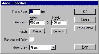 Настройка размеров рабочей зоны. Щелкните правой кнопкой мыши по рабочей зоне (белый экран в центре) и в появившемся меню выберите пункт Movie Properties. Здесь необходимо указать: частоту кадров при воспроизведении клипов (рекомендуется 12 кадров в секунду - стандарт для Quick Time), размер рабочей зоны в условных пикселах, цвет фона (в нашем случае - черный), единицы измерения для вертикальной и горизонтальной линейки. После всех изменений сохраните сделанные настройки для их использования по умолчанию с помощью кнопки Save Default. Настройка рабочей среды. Настройки рабочей среды (прорисовка изображения при редактировании, отображение сетки, линейки, панелей управления) сконцентрированы в пунктах меню View и Windows.