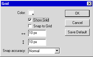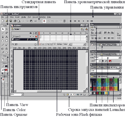 Для настройки сетки выберем пункт меню: View - Grid - EditGrid. После этого в диалоговом окне, показанном на рисунке, выберем цвет отображения сетки, установим атрибуты ее отображения и привязки, укажем шаг сетки по горизонтали и вертикали, а также выберем способ привязки объектов к сетке. После чего сохраним все сделанные настройки для дальнейшего использования по умолчанию кнопкой Save Default. Общий вид интерфейса Macromedia Flash 5 с сделанными нами настройками представлен на рисунке.