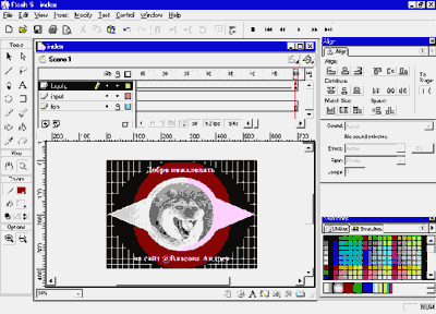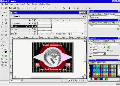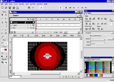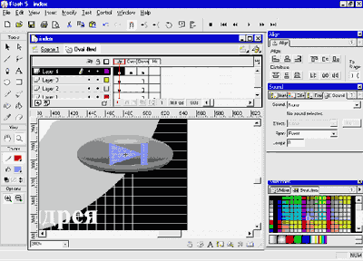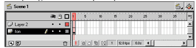 Итак, мы создали фон для нашей заставки. Теперь надо сохранить все в отдельном файле, чтобы оставить без изменений созданный ранее шаблон для других наших проектов. Необходимо помнить, что контур овала и сама заливка - это разные объекты, поэтому сразу же применим к ним операцию группировки (Modify Group). Так как наша заставка будет логотипом нашего сайта, т.е. запускаться по умолчанию, то присвоим ей имя index, в дальнейшем сгенерированный файл *.swf и HTML-файл будут иметь это имя. Создав фон будущей заставки, желательно сохранить его в отдельном слое. Остановимся на этой операции подробнее. Во многом мощь технологий Flash заключена именно в расширенных возможностях работы со слоями: наложение одного слоя на другой, изменение уровня прозрачности слоев по отношению друг к другу, реализация движений в различных слоях - все это позволяет создавать поистине мощные мультимедийные фильмы. Для работы со слоями используется набор инструментов из панели хронометрической линейки.