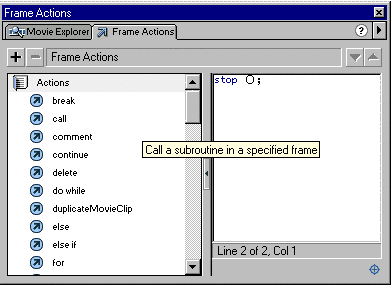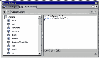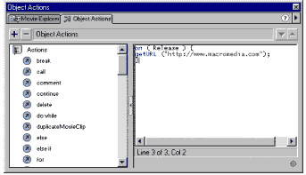 После того как кнопки нарисованы, они должны работать, т.е. в зависимости от действий пользователя вызывать те или иные события. Для этого их надо запрограммировать. Программирование кнопок осуществляется с помощью инспектора Object Actions, вызов которого осуществляется в меню, появляющемся по нажатию на изображение кнопки правой кнопкой мыши (пункт Actions). Добавьте для соответствующей кнопки приведенный выше текст и она будет работать. В подробности программирования пока вникать не будем.