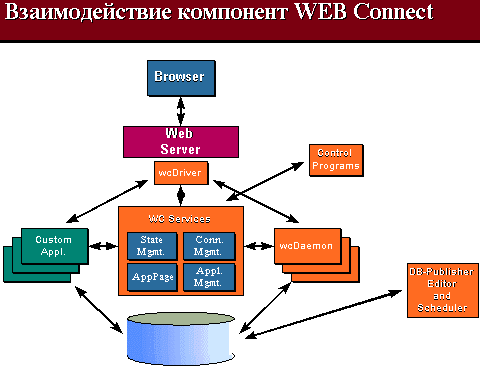 Небольшие комментарии по некоторым позициям. INFORMIX-Web DataBlade Module обеспечивает генерацию HTML страниц "на лету" на основе содержимого базы данных; поддерживает работу с любым браузером и web-сервером; поддерживает стандарты CGI, ISAPI, NSAPI, SGML; имеет мощное средство разработки и контроля Application Page Builder c набором готовых шаблонов. INFORMIX-Universal Web Connect - единая платформа, обеспечивающая работу единожды написанного web-приложения c любым из серверов, от INFORMIX Workgroup Server до INFORMIX XPS и Universal Server. Архитектура и механизм работы INFORMIX-Universal Web Connect показаны на рисунках 3 и 4. Помимо функциональности предоставляемой INFORMIX Web DataBlade, данный продукт обеспечивает: