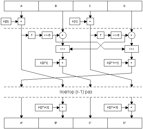 Финалист AES шифр RC6Алгоритм является продолжением криптоалгоритма RC5, разработанного Рональдом Ривестом (англ. Ron Rivest) очень известной личностью в мире криптографии. RC5 был незначительно изменен для того, чтобы соответствовать требованиям AES по длине ключа и размеру блока. При этом алгоритм стал еще быстрее, а его ядро, унаследованное от RC5, имеет солидный запас исследований, проведенных задолго до объявления конкурса AES. Алгоритм является сетью Фейштеля с 4 ветвями смешанного типа : в нем два четных блока используются для одновременного изменения содержимого двух нечетных блоков. Затем производится обычный для сети Фейштеля сдвиг на одно машинное слово, что меняет четные и нечетные блоки местами. Сам алгоритм предельно прост и изображен на рисунке 1. Разработчики рекомендуют при шифровании использовать 20 раундов сети, хотя в принципе их количество не регламентируется. При 20 повторах операции шифрования алгоритм имеет самую высокую скорость среди 5 финалистов AES.