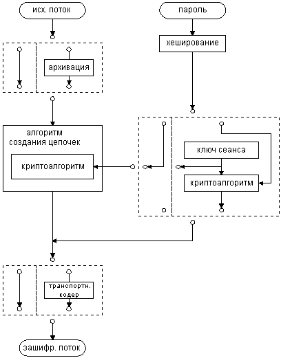 Общая схема симметричной криптосистемы с учетом всех рассмотренных пунктов изображена на рисунке 1.