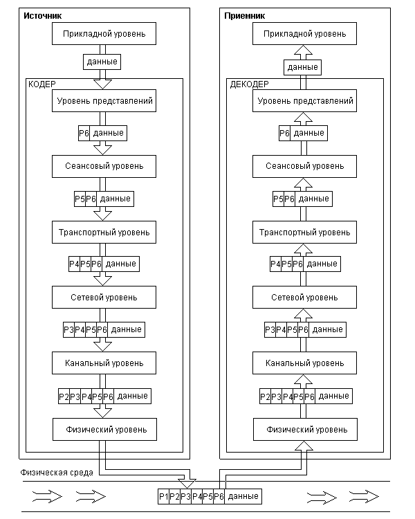 Уровни сетевых атак согласно модели OSIЭталонная модель взаимодействия открытых систем OSI (англ. Open Systems Interconnection) была разработана институтом стандартизации ISO с целью разграничить функции различных протоколов в процессе передачи информации от одного абонента другому. Подобных классов функций было выделено 7 они получили название уровней. Каждый уровень выполняет свои определенные задачи в процессе передачи блока информации, причем соответствующий уровень на приемной стороне производит преобразования, точно обратные тем, которые производил тот же уровень на передающей стороне. В целом прохождение блока данных от отправителя к получателю показано на рис.1. Каждый уровень добавляет к пакету небольшой объем своей служебной информации префикс (на рисунке они изображены как P1...P7). Некоторые уровни в конкретной реализации вполне могут отсутствовать.
