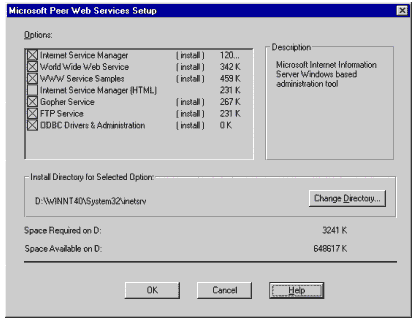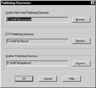 При необходимости можно сменить каталог, в который будет установлен IIS (кнопка ChangeDirectory:). По окончании нажмите кнопку OK. Далее нужно определить корневые каталоги для сервисов WWW, FTP и Gopher (рисунок 2.2).