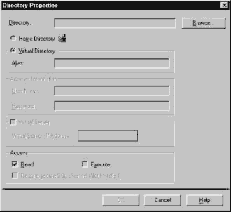 Рис. 2.7. Свойства каталога Здесь для каждого каталога можно установить его виртуальный образ (Alias). Можно ограничить права доступа к нему (Read, Execute). Если каталог берется из сетевого ресурса, то можно задать параметры доступа к данному ресурсу (AccountInformation: UserName, Password). Для сервиса WWW в системе WindowsNTServer 4.0 также имеется очень важная возможность организации виртуального Web-сервера. Для этого системе назначаются дополнительные IP-адреса и домены (Технология их назначения достаточно сложна и выходит за рамки данного практического курса.). Далее каталог просто назначается корневым каталогом для виртуального Web-сервера (VirtualServer, VirtualServerIPAddress). Это позволяет физически на одной машине вести сразу несколько Web-серверов с разными IP-адресами. На вкладке Directories также можно изменить перечисленные далее опции: