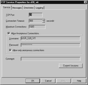 Настройка FTP В диалоге для сервиса FTP представлены следующие вкладки: Service, Messages, Directories, Logging. Некоторые из них содержат параметры, аналогичные параметрам WWW. Ниже будут рассмотрены только опции, отличающие FTP. Рассмотрим закладку Service(рисунок 2.9):