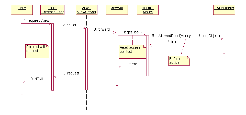 На даиграмме взаимодействия видно, что для проверки авторизации нам необходимо знать пользователя (вызов номер 4 имеет 2 параметра – пользователь и объект который он пытается удалить), то есть нам необходимо передать объект пользователь в методе номер 3. Следовательно, в каждый метод модели нам необходимо дополнительно передавать текущего пользователя, а если контроллер не является объектом, непосредственно получающим запрос (а как мы помним, объект User храниться в сессии), то и в каждый метод контроллера нужно добавить такой параметр.
