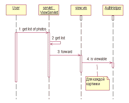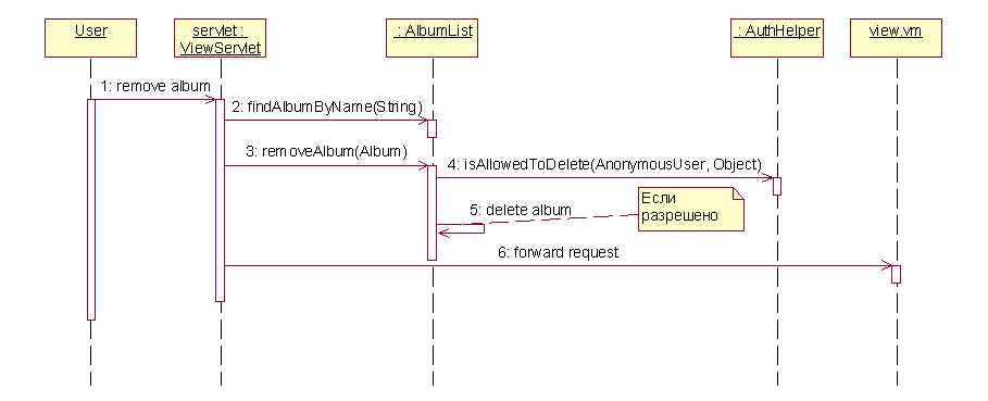 На диаграмме изображён запрос пользователя, обрабатываемый сервлетом, который с начала находит альбом, который нужно удалить (вызов номер 2), а потом пытается его удалить из хранилища альбомов (AlbumList – класс модели). Далее, хранилище альбомов проверяет, может ли текущий пользователь удалить выбранный альбом, используя класс системы авторизации (AuthHelper) и если такое разрешение получено, то удаляет альбом. Вызов номер 6 перенаправляет запрос на слой отображения.