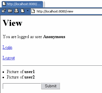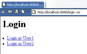 В нашем приложении аутентификация не реализована в полной мере, так как она не представляет интереса с точки зрения данной статьи. Существуют по умолчанию два пользователя User1 и User2, логин каждого пользователя осуществляется декларативно со страницы login.vm;