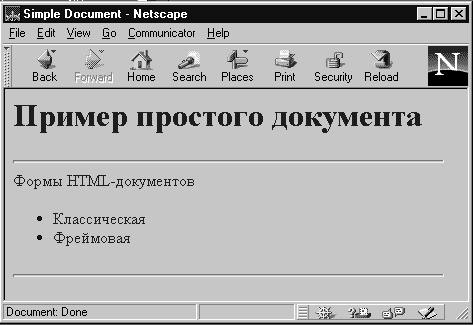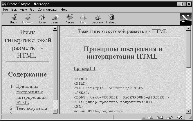 Рис. 1.1. Пример простого документа Компания Netscape Communication расширила классическую форму документа возможностью организации фреймов (кадров), позволяющих разделить рабочее окно программы просмотра на несколько независимых фреймов. В каждый фрейм может быть загружена своя страница HTML. Приведем пример документа с фреймами. Пример 1.2 <HTML> <HEAD> <TITLE>Frame Sample</TITLE> </HEAD> <FRAMESET COLS="30%,*"> <FRAME SRC=HTML-lecture.html NAME=LEFT> <FRAME SRC=HTML-lec-1.html NAME=RIGHT> </FRAMESET> </HTML>