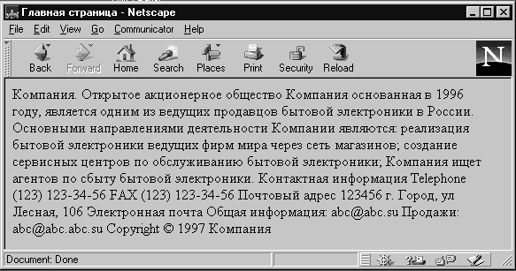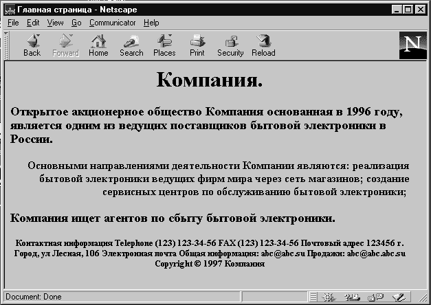Таги управления разметкойЗаголовкиЗаголовки обозначают начала разделов документа. В стандарте определено 6 уровней заголовков: от Н1 до Н6. Текст, окруженный тагами <Н1></Н1>, получается большим - это основной заголовок. Если текст окружен тагами <Н2></Н2>, то он выглядит несколько меньше (подзаголовок); текст внутри <НЗ></НЗ> еще меньше и так далее до <Н6></ Нб>. Некоторые программы, позволяют использовать большее число заголовков, однако реально более трех уровней встречается редко, а более 5 - крайне редко. Стандарт языка насчитывает 11 атрибутов у тага заглавие. Рассмотрим только АLIGN, т.к. остальные в большинстве программ интерпретаторов не реализованы. Для разбиения текста на параграфы используется таг <Р> в нем используются те же атрибуты что и заголовках. В качестве примера рассмотрим создание домашней страницы фирмы по продаже бытовой электроники. Пример 1.3 <HTML> <HEAD> <TITLE> Главная страница</TITLE> </HEAD> <BODY> Компания. Открытое акционерное общество Компания основанная в 1996 году, является одним из ведущих продавцов бытовой электроники в России. Ос-новными направлениями деятельности Компании являются: реализация бытовой электроники ведущих фирм мира через сеть магази-нов; создание сервисных центров по обслуживанию бытовой электроники; Компания ищет агентов по сбыту бытовой электроники. Контактная информация Telephone (123) 123-34-56 FAX (123) 123-34-56 Почтовый адрес 123456 г. Город, ул Лесная, 106 Электронная почта Общая информация: abc@abc.su Продажи: abc@abc.abc.su Copyright © 1997 Компания </BODY> </HTML>