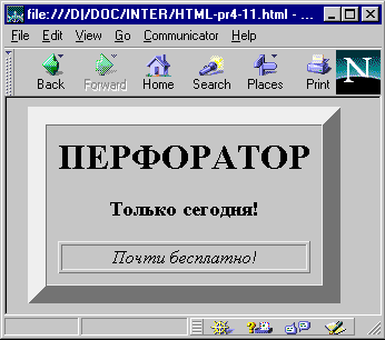 1.4. Использование таблиц в дизайне страницыПриятное свойство таблиц состоит в том, что если вы захотите, то можете сделать их границы невидимыми. Это позволяет с помощью тага <ТАВLЕ> красиво размещать на странице текст и графику. До сих пор таг <ТАВLЕ> остается единственным мощным средством форматирования в HTML. Дизайнеры Web-страниц сейчас обладают практически такой же свободой использования <пустого пространства>, что и создатели печатных страниц. Таблицы в большей мере, чем что-либо другое, помогают отойти от иерархического размещения текста на Web-страницах. Если броузер вообще поддерживает таблицы, он обычно правильно отображает наиболее интересные эффекты, полученные с помощью таблиц. Пример 1.20 <HTML> <BODY> <CENTER> <TABLE CELLPADDING=10 CELLSPACING=0 BORDER=16> <TR> <TD ALIGN=CENTER> <H1>ПЕРФОРАТОР</H1> <H3>Только сегодня!</H3> <TABLE BORDER WIDTH=100%> <TR><TD ALIGN=CENTER><I>Почти бесплатно!</I></TD> </TR> </TABLE> </TD> </TR > </TABLE> </CENTER > </BODY> </HTML>